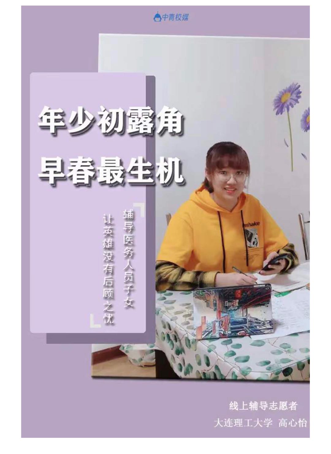 线上服务队,在星海湾2号街道莲花山社区线上挂职锻炼,积极开展“抗击疫情,我们在行动”社区服务立项活动。作为负责人,她积极与社区专干沟通,了解社区居民在疫情期间急需解决的问题,带领服务队成员线上宣讲疫情防控进展情况、病毒种类及研究、防疫生活常识,制作PPT、宣传海报,录制如何佩戴口罩、如何创建“大连健康码”等防疫小常识视频,还带领队员们走进视频直播间成为讲述者,歌颂和宣传“最美逆行者”先进事迹。为使社区居民更好的认知、了解疫情期间国家政策和新闻热点内容,在线上直播课后,服务队还开展了时事热点线上知识竞赛,通过这种更有趣味的方式,让社区居民更主动、积极的参与到学习疫情防控知识中来。另外,为响应教育部“停课不停学”的号召,服务队还积极开展“云辅导”,分享读书心得、交流体会,让朋辈居民居家期间不忘提升个人素养,增长阅历。高心怡同学还是85po