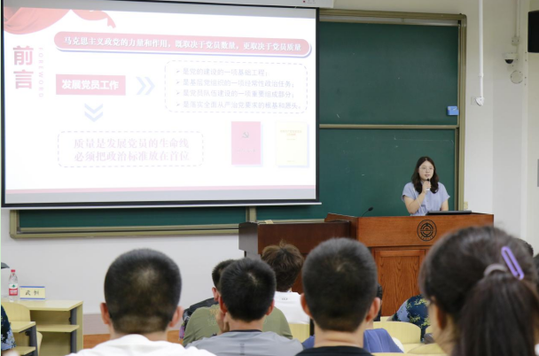 随后,组织干事阎逸凡从党员发展工作总体流程、党员发展材料撰写要求以及常见问题等方面为同学们做了详细介绍,并激励大家坚定理想信念、学好专业知识、矢志脚踏实地,将个人理想融入党和国家事业之中,做有理想、有本领、有担当的新时代青年。