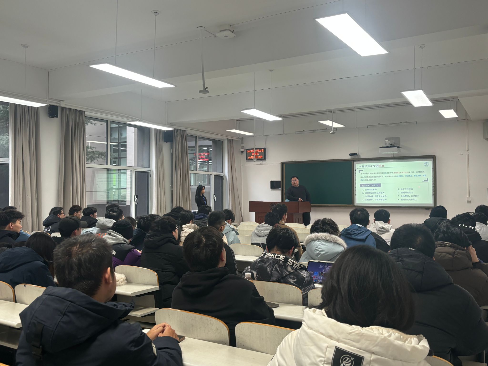 2026 届本科生毕业论文(设计)动员会于综合一号教学楼110 教室顺利召开。本次会议由学院副院长高峻峰教授主讲,旨在为即将步入毕业阶段的2026届本科生提供毕业论文写作的全方位指导,明确论文的撰写规范、时间安排及毕业相关核心要求,引导学生顺利完成毕业论文。