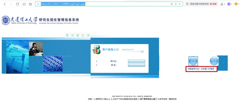 登录方式:招生导师该页面点击“切换登录方式:从校园门户登录”按钮,链接到校园门户,输入教工号和密码,进入系统。