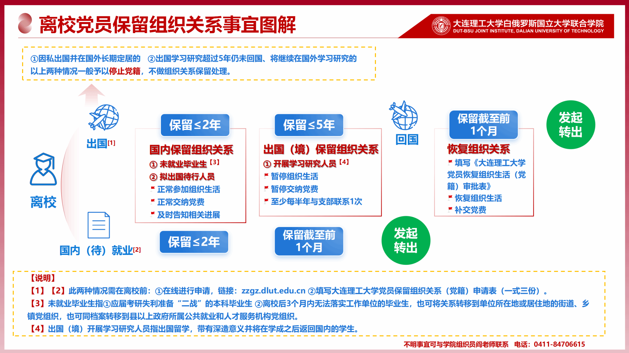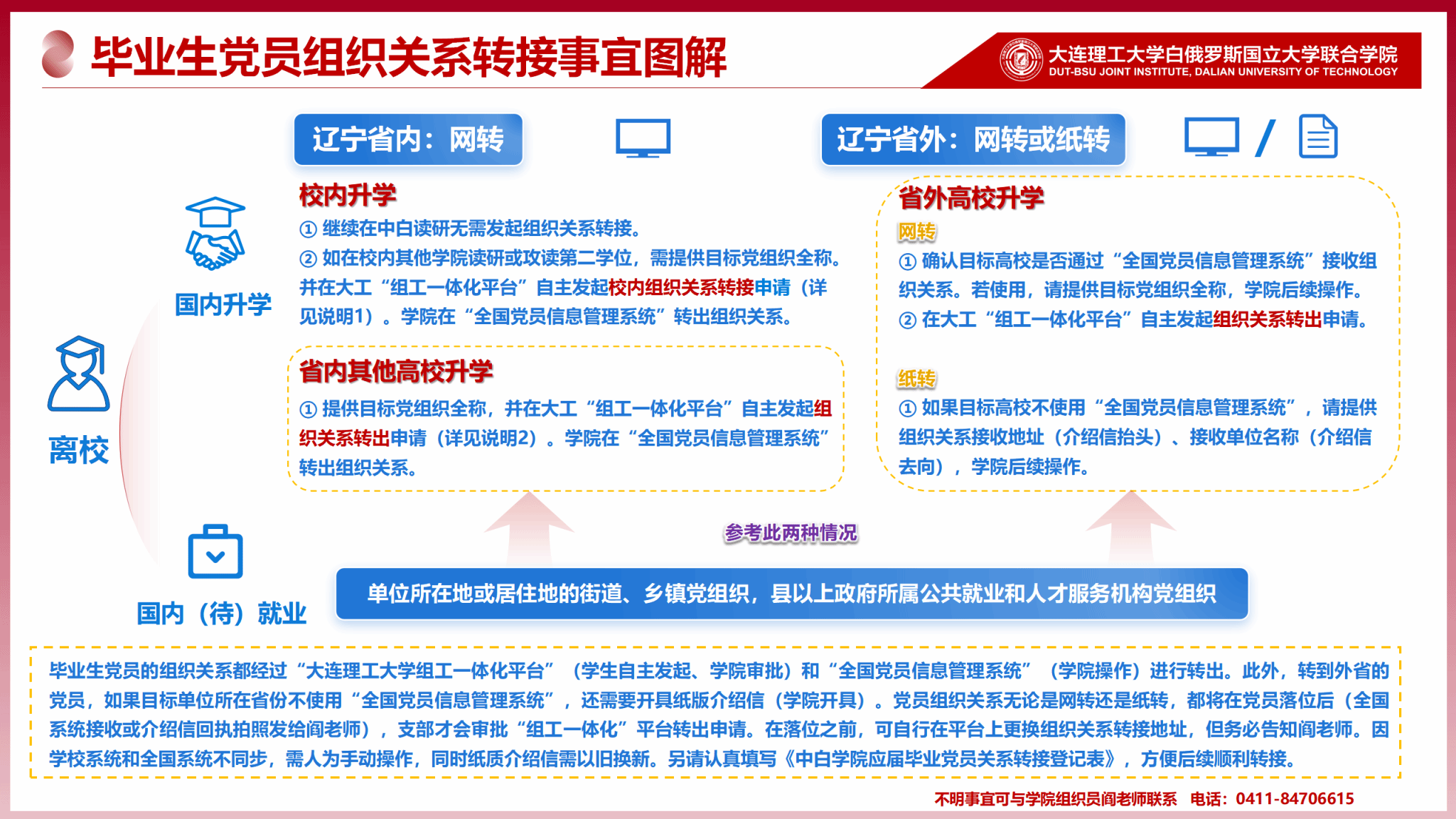 通过“全国党员信息管理系统”转出(网转)和开具纸版介绍信(纸转)由支部统一进行操作:请各位党员在有效期内尽快落实好组织关系,提醒转入单位在全国党员信息管理系统接收组织关系,或及时将介绍信回执联原件邮寄或拍照发送至阎老师(邮寄地址:大连市甘井子区凌工路2号85po